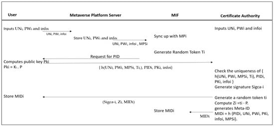 - User registration: Physical users can choose to register for a metaverse platform. In this phase, a user ID, a password, and other information is collected. The user is synced up with MIF through the metaverse platform server. The CA authorizes the user and then assigns a Meta-ID. This Meta-ID, a public key, and other relevant information about the user is stored in the blockchain for later verification.