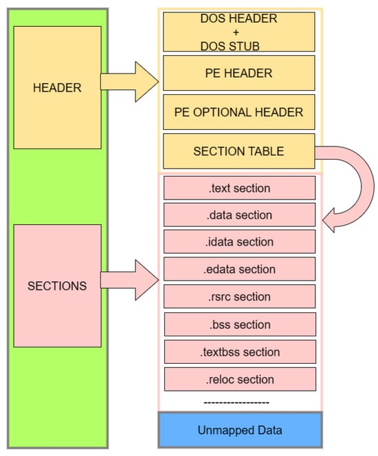 The structure of a PE file. The elements in yellow are included in the Header area. The elements in pink are included in the Section area. The elements in blue are included in the Unmapped Data Section area.