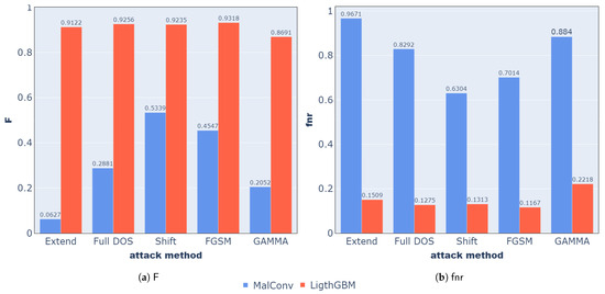 To complete this analysis, Figure 2a,b shows the and metrics measured for the pre-trained MalConv and LGBM models on the modified version of the evaluation dataset prepared for this study. Specifically, to this aim, for each attack method, we produced a modified version of the study dataset by replacing each original PE malware for which the attack method was able to generate realistic adversarial malware that fooled MalConv with the produced adversarial malware. We performed this analysis while considering and , as both metrics may have been affected by the evading ability of adversarial samples. In this analysis, the lower the value of and the higher the value of , the higher the evasion ability of the attack method with respect to the decision model, and consequently, the lower the integrity of the study decision model. Notably, both metrics confirmed that GAMMA is the attack method for this evaluation study; it was able to evade LGBM with a higher number of realistic adversarial samples generated by fooling MalConv.