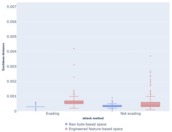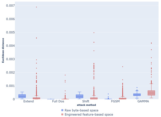 In this section, we analyse the distribution of the distance values that were computed between the original PE malware and the adversarial PE malware generated from each attack method considered in this evaluation study. This distance was measured through the Euclidean distance computed in both the raw byte-based input space of MalConv (where attacks were produced) and the engineered feature-based input space of LGBM (where the transferability of the generated attacks was examined). The Euclidean distance values were computed after scaling the input dimensions of all files between 0 and 1. Each distance value was divided by the number of dimensions in the input space in which it was calculated. This distance analysis was conducted to verify the existence of a possible relationship between the overall amount of changes introduced in the binary code of the adversarial PE files with each attack method and the corresponding amount of changes observed in the engineered features extracted for the same samples in the input space of LGBM. In addition, we intended to explore whether this relationship may be somehow related to the transferability of the attack method. The existence of such a relationship can be considered as a mechanism to foresee and explain the transferability of an attack method. Figure 3 shows the box plots of the Euclidean distance values computed between the original PE malware and the adversarial PE counterpart malware generated from each attack method considered in this evaluation study.