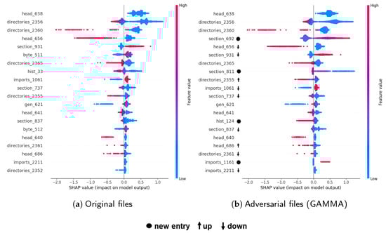 Global Shapley values measured for the top 20 input features (axis Y) of (a) and using GAMMA (b). The global Shapley values are plotted with respect to the feature value (axis X) for the 72 PE adversarial malware generated with GAMMA, which were wrongly classified in the “goodware” class according to and correctly classified in the “malware” class according to . Changes in the top ranking of the importance of input features for the model’s decisions are marked in (b).