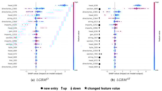Shapley values measured for the top 20 input features (axis Y) of the LGBM input space and plotted with respect to the feature value (axis X) for the original 4384 PE malware files (a) and the adversarial counterparts (b) produced using . Changes in the Shapley value-based feature ranking are marked in (b).
