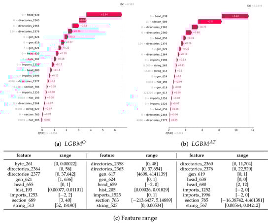 Local Shapley values (axis X) measured for the top 20 input features (axis y) of the decisions yielded via (a) and (b), respectively, for a a Windows PE malware file generated with GAMMA. This is one of the files in the file set explained in Figure 6. It was wrongly classified as goodware according to , while it was correctly classified as malicious according to . For each input feature, the value assumed by the feature in the study file is shown in the feature name reported on the axis Y in the FeatureName = FeatureValue format. The range of values that the ranked input features assume in the 72 PE malware files explained in Figure 6 is shown in (c). The Shapely value measured for each feature is reported in the corresponding feature bar. The higher the Shapley value, the more important the effect of the input feature on the decision using the LGBM model for the considered sample.