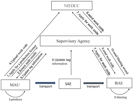 In the production of DEDs, the MAUs upload the work code to the NIEDCC and are put on record by the supervisory agent, and they can perform the production plan. The MAU’s management system is associated with the supervision system, which means that the production records are involved in the supervision system to prevent falsified DED records of the MAU. The digital electronic detonators are only purchased from the MAU by the SAE. The information system comprehensively maintains all the processes of the DEDs from production to consumption.