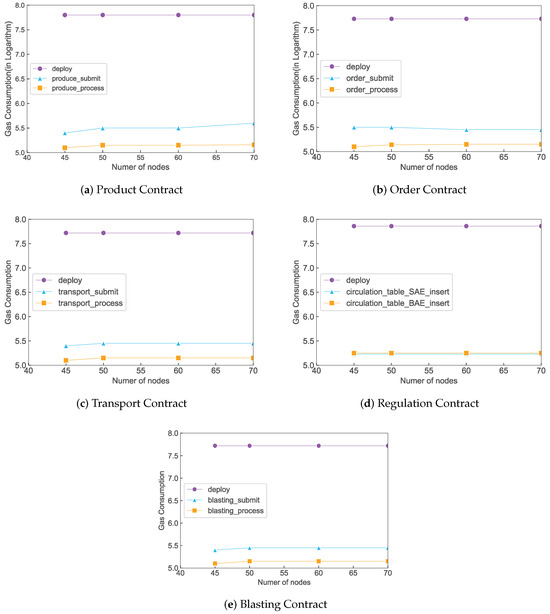 - Gap consumption: We examined the gas consumption for the smart contracts including both contract deployment, as well as contract calling. Every contract includes two functions. For example, the product contract corresponds to the function of pro_submit, and pro_process.pro_submit means that the MAUs submit production data to the supervision organization. pro_process means that the supervision organization processes the productapplication. We set the number of blockchain nodes to 40, 45, 50, 55, 60, 65 and 70, respectively. The results of varying the total number of blockchain nodes are shown in Figure 3. We introduced a logarithmic overhead to the gas consumption. Clearly, the gas consumption is small, and the gas consumption does not increase with the expansion of nodes. This is because the gasLimit was introduced to prevent a smart contract from consuming too many computational resources, and hence, we can take the gas consumption as a metric of system performance.