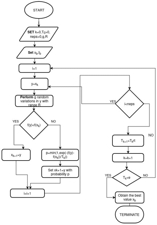 - For every in apply the modified Simulated Annealing algorithm given in Algorithm 1: