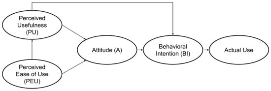 Following the literature, users’ acceptance and consequent adoption of technology are usually assessed either via the so-called Technology Acceptance Model (TAM), developed by Davis [], or via the more holistic Unified Theory of Acceptance and Use of Technology (UTAUT), proposed by Venkatesh and colleagues []. Both research models aim to understand the factors that determine the acceptance or rejection of a given technology by its users []. The TAM, which, due to its simpler structure, has been employed more often, focuses on information technology adoption, i.e., an individual’s intention to use the technology, based on its Perceived Usefulness (PU) and its Perceived Ease of Use (PEU). To this end, PU is considered the degree to which a person believes that using the technology would enhance his or her job performance, and PEU is the degree to which using the technology would be free of effort. PEU has been shown to have a direct effect on PU and a positive relationship with a user’s Behavioral Intention (BI), both directly and indirectly via its PU. Research has furthermore shown that there is a positive relationship between PU and a user’s BI via his/her Attitude (A) []. Davis’ original TAM is illustrated in Figure 1.