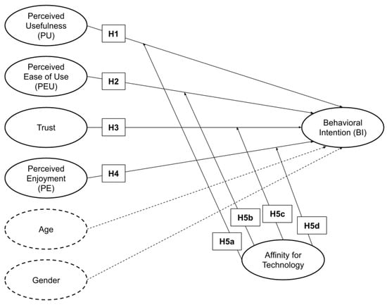 Studies show that existing knowledge about technology, a certain technological savviness, or simply an affinity for technology use has a substantial influence on the Behavioral Intention to use technology []. To this end, Bröhl et al. [] as well as Svendsen et al. [] theorized that Affinity for Technology would affect the relationship between predictor variables and Behavioral Intention. Similarly, Aldás-Manzano et al. [] stated that, when users are more technology-affine, they are also more likely to use a technology. Thus, we may consider that Affinity for Technology should have a moderating impact on the influence that PU, PEU, Trust, and PE have on BI.