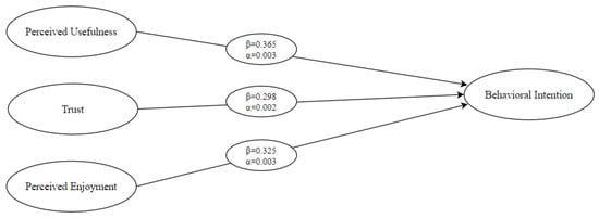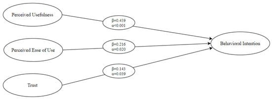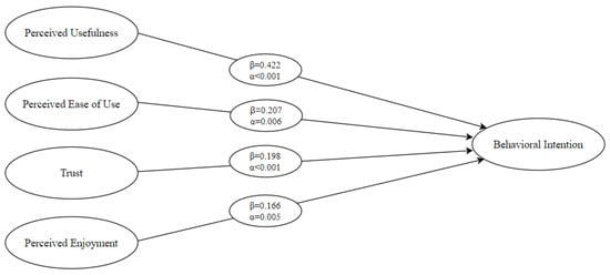 A linear regression analysis conducted with the entire sample points to a highly significant influence of PU on BI (; ), and PEU (; ), Trust (; ), and PE (; ) also show a significant positive impact on respondents’ Behavioral Intention to use a chatbot in an airport customer service scenario. The overall model fit lies at , explaining 66% of the variance and consequently showing that Hypotheses H1–H4 are all supported by the collected data (cf. Figure 4).