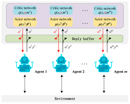 The core idea of the MADDPG algorithm lies in learning a centralized Q-function that is conditional on global information for each agent, aiming to alleviate the non-stationary problem and promote the stability of the training process [40]. In addition, to reduce the variance of the policy gradient, centralized training is adopted in an actor-critic learning framework [41]. The system architecture of centralized training is shown in Figure 3. During the training process, the central controller randomly extracts a batch of records (ot, at, rt, ot+1) from the experience playback cache to train the agent’s policy network parameters. The value network is used to evaluate the value of the agent taking a specific action a in a specific state st. The expected gain gradient for agent i is [42]: