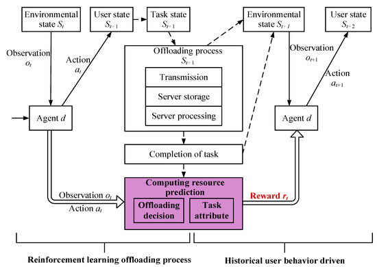 In order to solve the computing resource conflicts in multi-task concurrent scenarios, this paper improves the training process of the MADDPG algorithm to obtain better and faster offloading strategies. It is assumed that at the moment t, GRU-based deep reinforcement learning obtains the state of the server in the MEC network from the existing multi-user concurrent scenario and makes the corresponding offloading action at based on the observation value. The offloading action directly affects the current service user state and updates the existing task state, and the user decides whether to offload the task or not based on the action value. When the task enters the offloading state, it will go through different stages of state changes such as data transmission, edge node storage queuing, node processing, and execution completion. During the task execution, the computing resources of the MEC server continuously and dynamically change. After the execution of this round of action, the agent obtains the corresponding feedback rt from the environment and the state St+1 of the environment at the next moment. The agent stores the data (st,at,rt,st+1) recorded in this round of training in the return experience pool and utilizes the data to train its own network data. As can be seen in Figure 4, this paper improves the training process of reinforcement learning, in which the agent cannot obtain the immediate reward rt from the environment feedback but only the reward rt−1 obtained from the training in the previous moment. At the moment t+1, because the GRU module in the deep neural network helps to memorize the historical offloading decisions and the task information, the agent selects the current offloading action based on the information of the user’s behavioral prediction, the reward rt from the previous moment, and the current moment t+1 observation information, to select the offloading action for the current round.