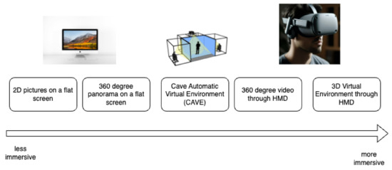 We rank the CAVE as lower than HMD setups because the CAVE is still projected onto flat-screens [24]. The CAVE is ranked higher than 2D pictures and 360-degree panorama on flat-screens because it allows greater free movement [24].