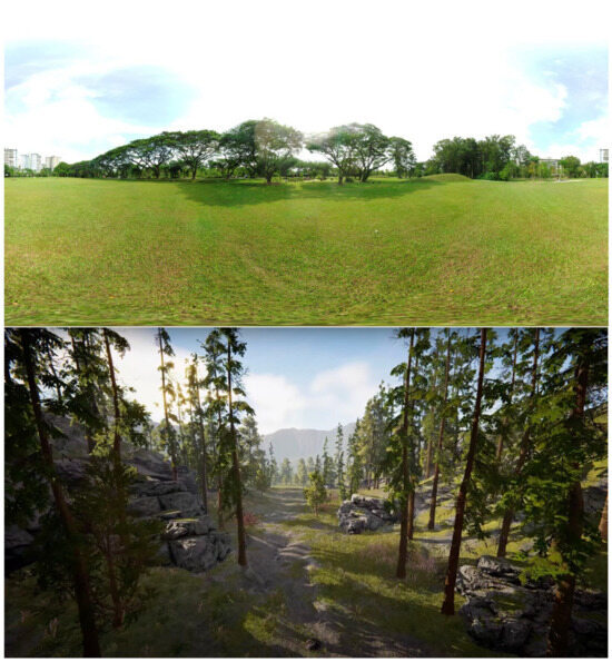 Top: An example of a 360-degree landscape panorama that can be used to simulate a virtual experience of nature. Bottom: A 3D virtual environment filled with natural elements (trees) in the Unity game engine.