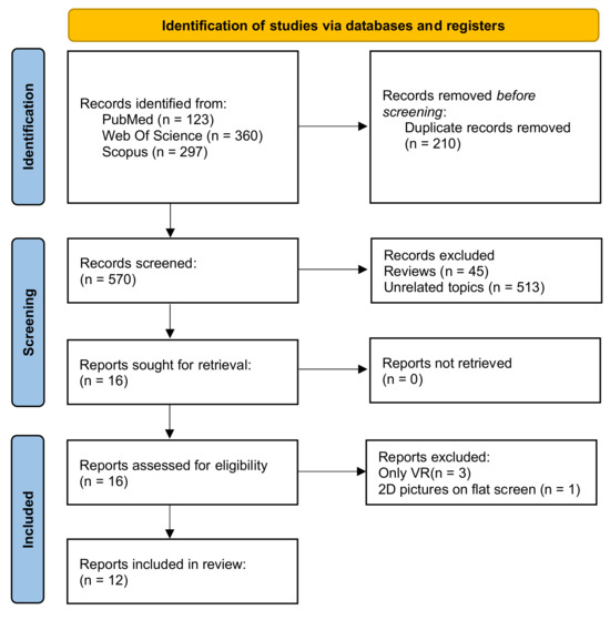 Flow chart of screening and selection process. We retrieved articles from PubMed, Web of Science, and Scopus. Duplicates were removed and the remaining articles were screened for relevance to environmental psychology and virtual reality (VR). Finally, the full texts of relevant articles are retrieved and screened, resulting in 12 articles for review.