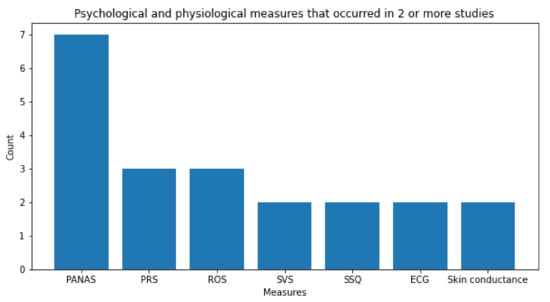 The infrequent use of physiological measurements such as ECG and EEG suggests an area of future research. Physiological measurements may serve as more objective measurements unlike psychological questionnaires, which can be biased by location and intervention methods and expectations.