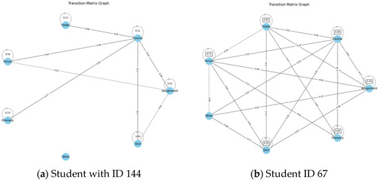 As mentioned in the previous section, sequences were generated as each user progressed through various states, forming their sequence of events. Changes observed in the states across the sequence are termed transitions, with associated probabilities known as transition probabilities. The code employed iterates through each sequence in the dataset, capturing the transition from one state to another along with its probability. This process effectively constructs and utilizes a Markov Chain Model to represent state transitions based on data-derived probabilities. These transition probabilities were then used to populate a transition matrix. Multiple transition matrices were generated, representing the behavior of each individual participant (e.g., student with ID 144—Table 2).