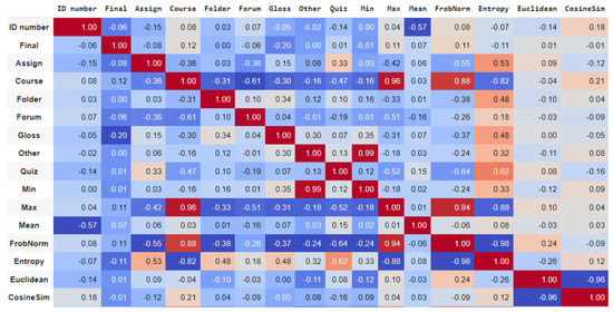 - Upon reviewing the provided data, it becomes apparent that all students display relatively high Cosine Similarity values, ranging from approximately 0.96576 to 0.99713. While there are slight variations among the Cosine Similarity values of different students, they all remain close to 1, indicating a strong resemblance between each student’s profile vector and the mean student profile vector in the 7-dimensional space. Similar values were calculated for all students. Contradictory and unexpected data reflect the complex and diverse ways in which students engage with Moodle and achieve academic success. As a result, further correlation analysis of individual student profiles and behavior patterns was scheduled to better understand the underlying factors and determine the correlations between students’ final grades and all the measures associated with transitions within Moodle.