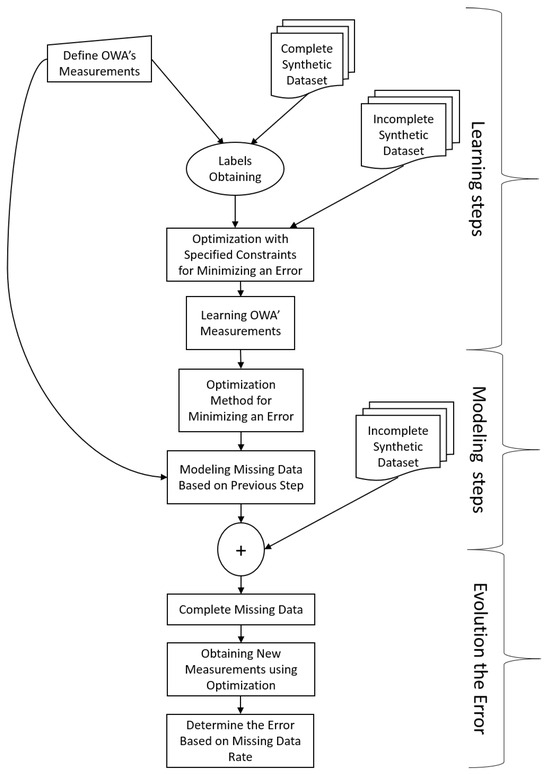 This work’s primary goal is to learn the OWA weighting vector where the missing data samples exist, i.e., the estimated OWA weighting vector can be modeled related to the OWA weighting vector with the existing complete data point. In other words. After generating all data, arrange the data values in descending order to provide a decision maker based on the newly assigned OWA weighting vector. Upon assuming the values of the OWA weighting vector such as the softmax OWA weighting vector, the data point labels are obtained according to Equation (4). Next, assign the percentage of missing data volume. For example, 10% or 20% of the total observation dataset has missing values within each data point. These values can be randomly picked for each data point. Since the data point, including the missing samples and the labels, is available, new weighted vector values are produced using the data point with the missing data samples. This label was determined when the complete dataset was available earlier. The estimated weighting vector rs is now determined, which has the same dimension as in the incomplete dataset. Since two sets of OWA operators are obtained, one where the complete dataset exists and another with an incomplete dataset, the new expression is obtained between the estimated OWA operator and the original OWA weighting vector. This expression can be solved using the quadratic form with specific constraints, as shown in Equation (5), to determine the coefficient parameters. Each estimated OWA operation has an expression in terms of the original values of the OWA weighting vector, and this expression can be used to predict the missing data sample. The missing values within the data point will be regressed on other variables based on the relationship between the estimated OWA weighting vector and the original operators. The missing values will then be replaced by the predictive values obtained. Similarly, each data point with missing values can replace its missing values with predicted ones.