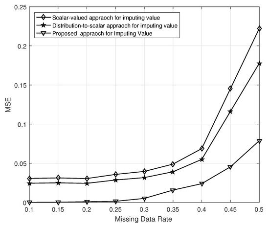 Furthermore, we also show the performance of the proposed approach when the observation is a real-world dataset having nine attributes. In this case, the number of rings represents the label of these observations. Four different features are used to represent the observations in which we assumed that there is missing data. Missing data are randomly chosen where the number of observations is the same as in the first scenario. Different missing numbers are also applied to verify the reliability of our approach. Figure 4 shows the error versus the percentage of missing data. As in the first scenario, a different number of missing inputs is assumed to aggregate the data. From these experiments, it can generally be observed that even when there are significant effects of missing input for most cases, the proposed approach maintains a better performance against missing input in data aggregation, i.e., the proposed method has enough potential as a robust approach to aggregate missing inputs in datasets.
