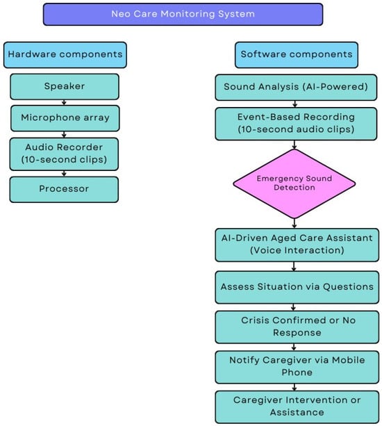 The Neo Care Monitoring System, hereinafter referred to as “Neo”, is a compact device that employs AI and assistive technology to identify household sounds that may signify emergencies, including falls (Figure 1). The Neo operates similarly to popular smart speakers, like Google Home. Its main purpose is to listen for sounds that could signal potential issues, such as cries or the sound of breaking glass. It records 10 s audio clips of various events for analysis and can engage in voice interactions to assist occupants during emergencies. Upon detecting a concerning sound, Neo activates an AI-driven aged care assistant that converses with the user to assess the situation through a series of questions. If a crisis is confirmed, or there is no response, Neo attempts to contact a designated caregiver or relative’s mobile phone. The core algorithm driving Neo’s functionality is a machine learning model trained on a vast dataset of audio samples representing various household sounds and events, including potential emergency situations like falls (Figure 2). This algorithm continuously analyzes the incoming audio stream from Neo’s microphone, identifying patterns that may signify a concerning event, which then triggers further analysis and response workflows. Additionally, the algorithm leverages natural language processing capabilities to engage in contextual voice interactions with users, interpreting responses to accurately assess emergencies and determine appropriate actions. This system offers a potentially more cost-effective solution compared to other environmental monitoring systems, especially those requiring a multitude of smart devices and sensors. However, this innovation solution requires rigorous evaluation before it can be widely adopted.