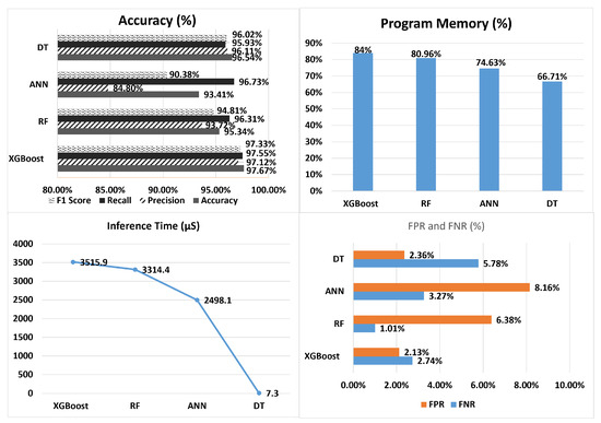 The smart thermostat uploads the data on the AWS cloud server (http://16.170.215.67/display). The smart home application provides users with remote access to turn ON/OFF the HVAC through the webpage. This bidirectional communication is vulnerable to DoS and MITM attacks. Using our smart thermostat dataset, we trained XGBoost, DT, RF, and ANN for IDS implementation on the smart thermostat. The testing results of the IDS implemented with XGBoost, RF, DT, and ANN are shown in Table 9. The IDS implemented with XGBoost (depth = 8, estimator = 100) achieved the highest accuracy of 97.66%. The best accuracy achieved with RF (depth is 8, estimators = 20) is 95.33%, with DT (with a depth of 15) it is 96.54%, and with ANN it is 93.41% as shown in Figure 4. The accuracy, F1-score, recall, and precision are summarized under the subfigure titled Accuracy (%), whereas the comparison of program memory requirements, inference time, FPR, and FNR are also shown in Figure 4. The results clearly show that although the inference time of XGBoost is high and it requires more program memory, it outperformed DT, ANN, and RF in terms of accuracy, F1-score, recall, precision, FPR, and FNR.