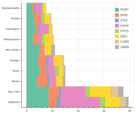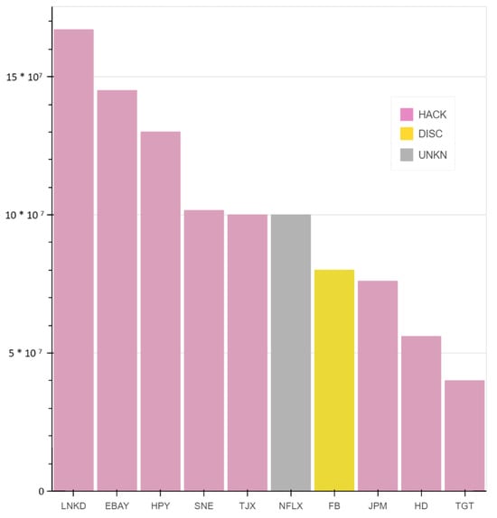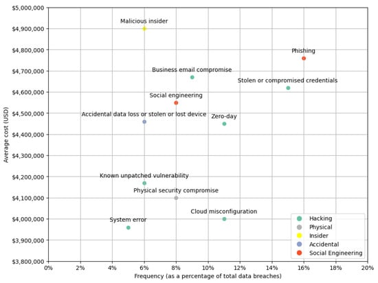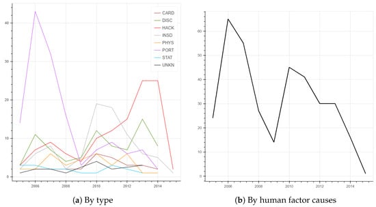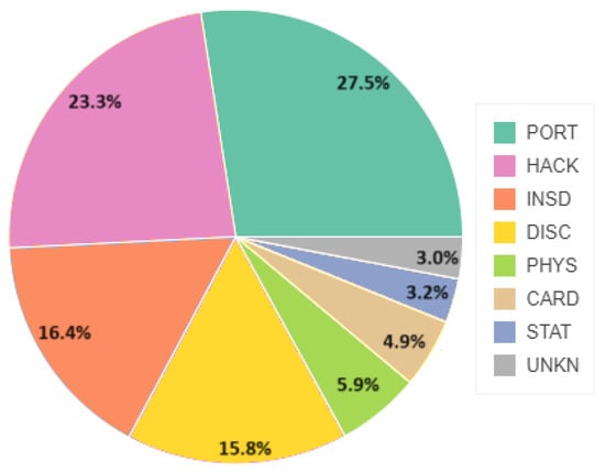 58]. However, when categorizing these attack vectors into the types of the dataset, it was observed that the majority of them were related to hacking activities (HACK). The ‘Accidental’ label in the figure may be associated with the union of the DISC, PHYS, STAT, and PORT types of the dataset, while ’Physical’ may be associated with the union of PHYS, STAT, and PORT. Social engineering and phishing, which may be considered a type of social engineering, are not strictly related to a category of the dataset.