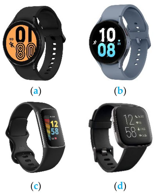 (a) Samsung Galaxy Watch 4; (b) Samsung Galaxy Watch 5; (c) Fitbit Charge 5; (d) Fitbit Versa 2.