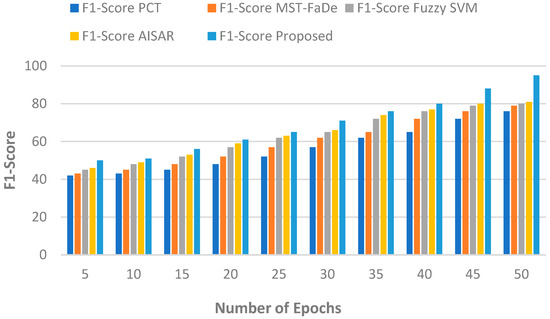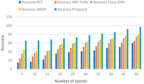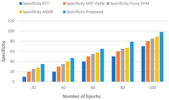 Figure 7 displays the specificity, while Table 7 shows the specificity’s numerical results. When compared to other current techniques, like PCT, MST-FaDe, fuzzy SVM, and AISAR, the recommended approach provides exceptional specificity. That is the overall utility as the number of epochs increases. The greatest specificity of the suggested methods is 98% in terms of epochs; by comparison, the maximum specificities of PCT, MST-FaDe, fuzzy SVM, and AISAR are 70, 80, 85, and 89 bits per second, respectively. Our suggested strategy outperforms the current ones in terms of specificity.