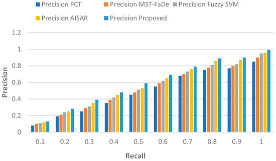 PCT initiates with a low precision of 0.08, gradually improving precision as the recall rate rises, reaching an accuracy of 0.85 and a recall rate of 1.0; MST-FaDe initiates with a low precision of 0.10, increasing accuracy over time while maintaining a constant recall rate, reaching an accuracy of 0.90 and a recall rate of 1.0; Fuzzy SVM initiates with a low precision of 0.11, steadily enhancing precision as the recall rate ascends, achieving an accuracy of 0.95 and a recall rate of 1.0. AISAR begins with a reasonable precision of 0.12, which rapidly improves alongside the recall rate, attaining a precision of 0.96 at a recall rate of 1.0. The proposed model demonstrates the highest precision among the five models, commencing at 0.13 and progressively improving, culminating in a precision of 0.99 at a recall rate of 1.0.