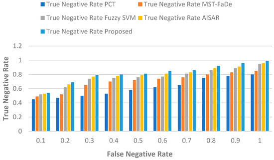 At a false negative rate (FNR) of 0.1, PCT has a true negative rate (TNR) of 50 (1–0.50) and gradually enhances its TNR as the FNR increases, reaching 0.05 at a FNR of 1.0. MST-FaDe has a true negative rate (TNR) of 49 (1–0.51) at a false negative rate (FNR) of 0.1. Its TNR steadily improves as the FNR rises, reaching 0.05 with a false negative rate of 1.0 at an FNR of 0.1. Fuzzy SVM has a TNR of 0.48 (1–0.52) and gradually enhances its TNR as the FNR increases, reaching 0.05 at an FNR of 1.0. AISAR exhibits a similar pattern, beginning with a slightly higher TNR of 0.47 (1–0.53) at an FNR of 0.1 and improving to 0.04 at an FNR of 1.0.