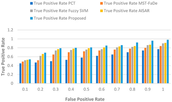In practical terms, PCT starts with a true positive rate (TPR) of 0.45 and gradually elevates the TPR with a rising false positive rate (FPR), achieving 0.77 at an FPR of 1.0. The true positive rate (TPR) of MST-FaDe is initially set at 0.49, and it is progressively increased with an increasing false positive rate (FPR) to reach 0.84 at an FPR of 1.0. Fuzzy SVM starts with a TPR of 0.52 and gradually elevates the TPR with a rising FPR, achieving 0.90 at an FPR of 1.0. AISAR exhibits a similar trajectory, initiating with a TPR of 0.53 at an FPR of 0.1 and escalating to 0.91 at an FPR of 1.0. The proposed model begins with a TPR of 0.54 at an FPR of 0.1, consistently outperforming the prior models, and achieves the highest TPR of 0.98 at an FPR of 1.0. Table 6 represents the numerical outcomes, and Figure 6 illustrates the trade-off between TPR and FPR for all models, demonstrating that the proposed model consistently sustains a higher TPR while managing FPR, indicative of enhanced classification task performance.