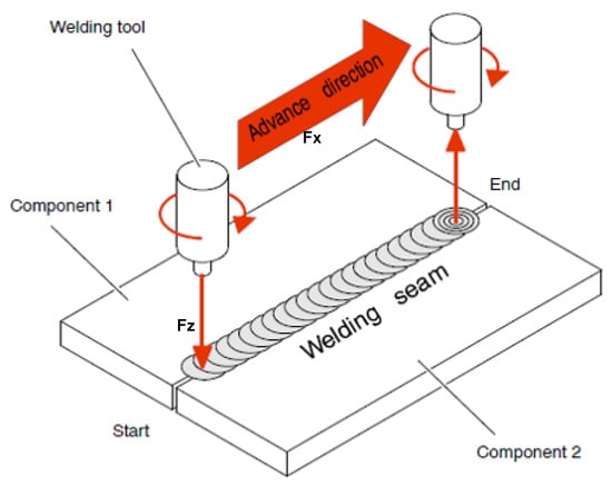 Friction welding is a solid-state welding process in which heat is generated by the mechanical friction between a rotating tool and the workpieces to fuse the materials, as depicted in Figure 1. In addition, the tool has a lateral displacement in the direction of the X-axis to displace the materials.