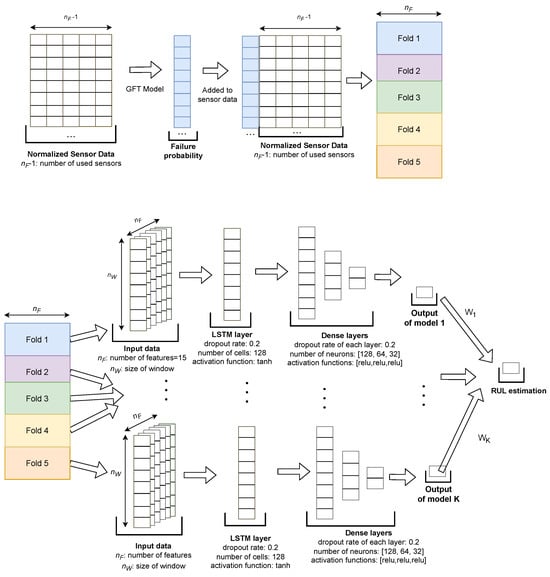 The training data are divided into folds, each represented by a different color. In this setup, each fold is used as validation data, while the remaining folds serve as training data, resulting in the development of five distinct models. The final RUL prediction is generated by averaging the outputs of these individual models. As depicted at the bottom of Figure 2, the deep learning (DL) model comprises an LSTM layer, followed by three dense layers, each incorporating a dropout rate of 0.2. For more comprehensive details regarding the k-LSTM-GFT model, please refer to [].