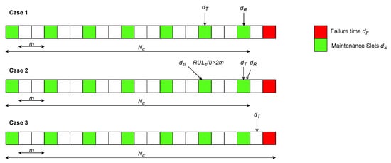 At each maintenance slot , a maintenance action may be triggered, and a replacement of a component may be performed. The proposed maintenance scheduling approach intends that a replacement is scheduled at time slot to be performed at if the estimated RUL considering the safety factor falls between m and . This scenario is represented in Case 1 in Figure 3. The replacement is planned m days ahead, thus, there is no cost associated with the action.