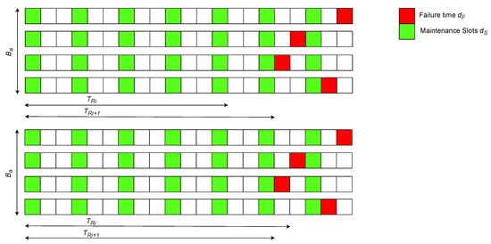 Each asset is allocated a set of maintenance slots that are equally distributed at intervals of m days. Periodic maintenance tasks and inspections may only be performed in these slots. If a given component v needs to be replaced at , this intervention should be planned at the latest in the previous maintenance slot, , to have a spare part available in stock. If the replacement of a given component is planned at a given slot, , to be performed during , the enterprise incurs an out-of-stock cost, , [] since the replacement was not planned in advance.