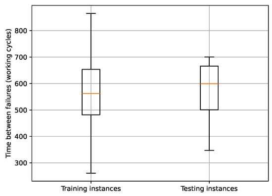 The PM scheduling approaches described in Section 6 offer a significant advantage in some use cases, as they only rely on the data on the time between failures. In Figure 5, we illustrate these data for both training and testing instances of the friction welding use case. During the training phase, we use the distribution of the time between failures to define a replacement strategy, which is then applied to the testing data to evaluate the associated costs. It is noteworthy that the distribution of training instances varies from that of testing instances. This suggests that using a fixed value for the time between interventions may not be as cost-effective for the testing data as it was for the training data.