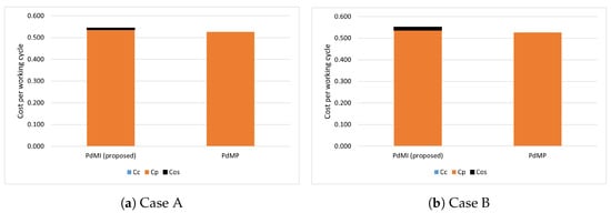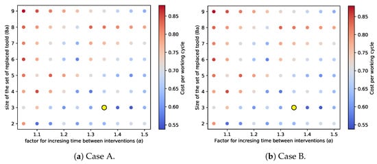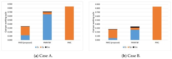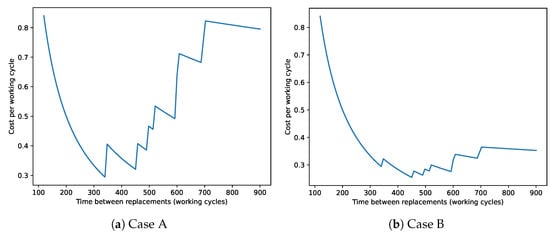 In Case A, the optimal is closer to the minimum time between failures compared with Case B, as shown in Figure 6a. Here, a conservative approach yields more interesting results, as significantly outweighs . However, in Case B, where the costs are more balanced, the optimal is closer to the MTBF, as can be seen in Figure 6b. The most widely used PM approaches, such as PMC or PMMTBF do not represent the optimal solution economically for different scenarios, which highlights the necessity of having a more flexible PM scheduling strategy.