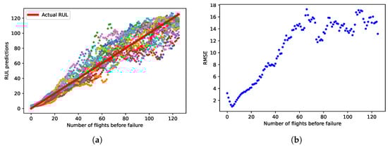 The k-LSTM model was integrated into the maintenance scheduling framework to leverage the failure probability estimated by the GFT for calculating a dynamic safety margin in the RUL prediction. For testing and evaluation, the training set of FD001 was split, with 80 engines used for training the k-LSTM-GFT model and the remaining 20 engines for testing. The results of these test instances are presented in Figure 9a, displaying the RUL prediction outcomes. Additionally, Figure 9b illustrates the root-mean-squared-error (RMSE) as an evaluation metric plotted against the number of flights until failure. The RMSE of the model is lower when the actual RUL decreases, which means that the model is more accurate near the failure point. This occurs because the degradation patterns are more pronounced near failure when the model’s accuracy is more critical.