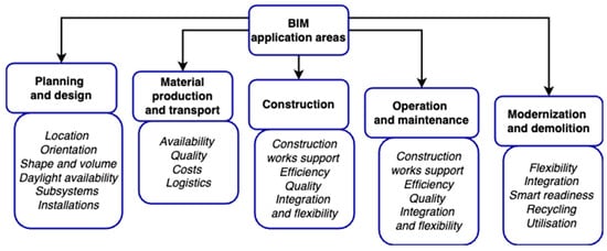 For many years, the construction industry has been convinced that BIM is an approach and tool that primarily improves the design processes and effective implementation of modern buildings. The utilization of digital models of building structures, their installations, and their system infrastructure facilitate the collaboration of designers and contractors from various industries, thereby reducing the time required for completion of the project while simultaneously enhancing the quality of the final product [,]. Nevertheless, the technological advancements that have occurred over the past decade or so, encompassing the evolution of computer techniques, the development of advanced engineering software, and innovative technologies of building infrastructure systems, have led to the expansion of the areas of BIM applications also during the period of buildings’ operation. At present, numerous industry experts and engineering teams emphasize that BIM can be used at any stage in the life cycle of a building or infrastructure, from design to operation, as indicated in both [,], summarized in Figure 1.