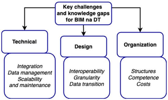 It is possible to encounter difficulties at any stage of the integration process. One challenge is the multitude of file formats and data exchange standards used in various BIM software programs and DT platforms. One of the key priorities in the development of tools to translate data between different formats is to ensure that this process is as efficient as possible. It is inevitable that information will be lost when data are transferred between stages [].