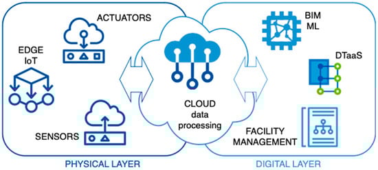 The aforementioned elements render the DT approach particularly useful in supporting building and infrastructure management procedures during the building’s operation period, complementing the solutions and possibilities offered by BIM []. It is of particular importance to note that DT solutions utilize real data from the serviced facility, which predisposes them to cooperate with extensive modules of modern BACS and smart home systems and also from the perspective of integrating IoT solutions.