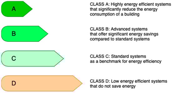 The rapid development of BACS technology over the past two decades has resulted in the need to systematize not only communication and data transmission standards but also the automation functions themselves along with the principles of their functional integration. In the first decade of the 2000s, the EN 15232 standard entitled “Energy performance of buildings—Impact of Building Automation, Controls and Building Management” was developed, which was updated several times. The latest version from 2017 [] introduces four categories of BACS, marked with letters from A to D depending on their impact on a building’s energy efficiency, as shown in Figure 5 [,]. It is crucial to note that these categories differ from the energy efficiency classes of entire buildings as defined in the EN ISO 52003 standard [].