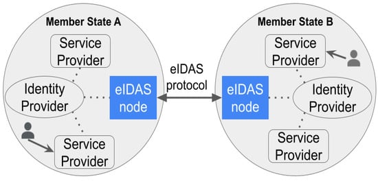 The EU does already have a regulation on electronic authentication systems (eIDAS—Regulation EU No. 910/2014 on digital identity), which was issued in 2014 but has been effective since 2016 [21]. The eIDAS (electronic IDentification Authentication and Signature) is a European framework that permits secure authentication with national credentials when accessing online services in any Member State (MS). The aim is to create a standard normative framework for trusted and secure online interactions between individuals, enterprises, and government agencies, as well as to improve the efficiency and security of online services and transactions within the European Union. The MS who wants to adhere to eIDAS must notify electronic identification (eID) schemes to the European Commission. Furthermore, if a MS wants to grant access to an online public service through an eID scheme, then it must also accept the notified schemes of other countries. The national eID schemes are interoperable thanks to the eIDAS Solution, which consists of a protocol designed to convert national identification data into a standard format that MSs can understand and use, as depicted in Figure 2.