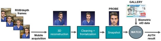 In the following section we propose a novel solution to improve the performance of a facial recognition system, exploiting the eID’s biometric data. More details about the implemented solution can be found at [32]. The solution envisages 3D reconstruction technologies, such as monocular reconstruction and depth sensor scans, to create a 3D model of the user’s head; such a model, cleaned of environmental noises (light conditions, background, others), can be used to generate a frontal snapshot of the face, to be compared with the CIE’s image. A schema outlining the authentication pipeline is depicted in Figure 4. The probe image is generated as a snapshot of the user’s 3D facial model, while the gallery image is retrieved from the eID card using NFC technology. Both images are then processed through a machine learning face recognition algorithm to obtain the final authentication result.