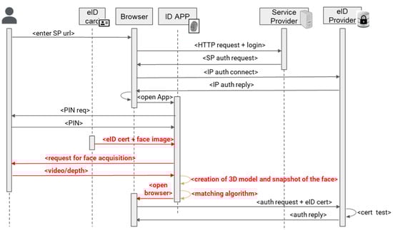 User authentication is initiated by the IdP, which requires activating the 3D acquisition and reading of the CIE data. A specific biometric ID app will allow 3D data to be acquired, the face model to be reconstructed, and the snapshot to be created before executing the verification algorithm (in red in Figure 5). The outcome of the verification will then be sent to the Identity Provider, who will reply to the Service Provider. The authenticity of the process and of the card used is verified by sending the X.509 digital authentication certificate present in the document chip and protected by the PIN code.