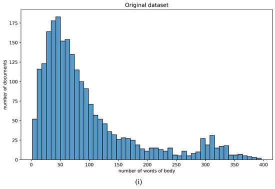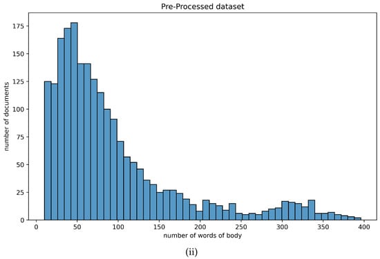 The statistical information concerning the textual attributes of the dataset at hand is summarized in Table 1. As illustrated in Figure 1, the vast majority of the corpus comprised short-text documents (i.e., ranging from 10 to 100 words), while 25% of the documents had a body of less than 41 words. These observations indicate that the dataset contained rather short-text samples. More important, however, was the fact that there existed a uniformity across the original and the pre-processed dataset, which enabled the employment of standard clustering algorithms. Figure 1 illustrates how the number of words was distributed across the totality of the corpus at hand.
