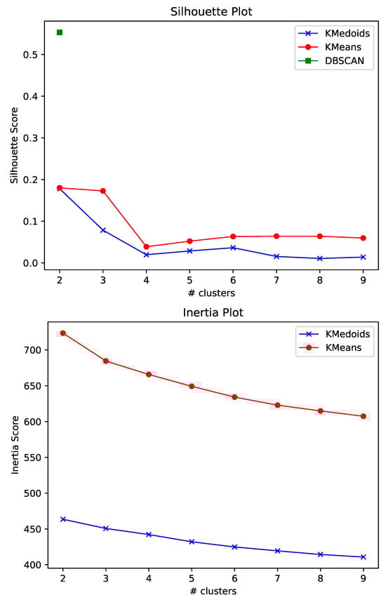 The Silhouette and Inertia plots obtained by running each algorithm multiple times with varying numbers of clusters. Concerning DBSCAN, we do not report the Inertia results, as the concept of Inertia only applies to partition-based clustering algorithms. K-Medoids overall demonstrated better results across each experiment, while using the ELBOW method we can extract from the figures that the best option concerning the number of clusters is two.