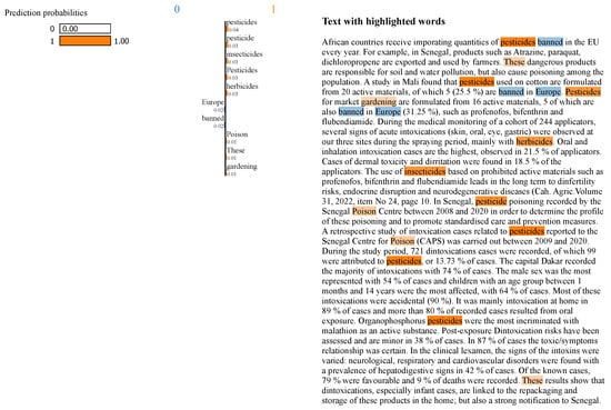 The XAI models utilized to gain insights and provide meaningful explanations about the clustering process were developed with the Python programming language; we particularly relied on the PyTorch, LIME, and SHAP libraries. For each document, we can create an interactive HTML file using the SHAP library, where users can click on individual words to examine their significance. Similarly, LIME generates either a list of words that are significant for the prediction or an HTML file containing the original text with the most important words highlighted. Figure 3 illustrates an example of a document analyzed with SHAP, while Figure 4 presents the LIME output for the same document.