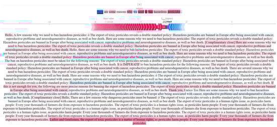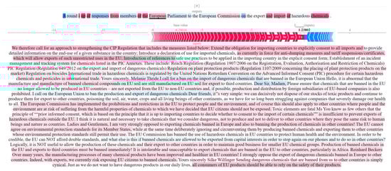 The dataset utilized for our experiments contained 2310 issues extracted from the “Have your say (https://ec.europa.eu/info/law/better-regulation/have-your-say/initiatives/13750-Hazardous-chemicals-prohibiting-production-for-export-of-chemicals-banned-in-the-European-Union_en, accesssed on 5 March 2024)” platform. The issues concerned a discussion initiated about hazardous chemicals and the potential prohibition of exporting chemicals banned in the European Union. Each instance contained the feedback provided by the users, as well as important metadata, such as the date of creation, the username, the country of origin, etc. We primarily focused on the ‘englishfeedback’ column that contained the textual data that we utilized for the proposed approach. In our experiments, we made the following assumptions: (i) we disregarded instances that contained 10 or less words, thus filtering out noisy data points; (ii) we removed duplicated comments, as they might lead to overfitting issues without adding more information; (iii) we removed highly similar texts, to ensure the robustness of our method.