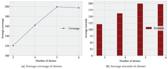We test the performance of different numbers of drones in dynamic scenarios. As evident from Figure 7a, when the number of drones reaches five, the drone network can achieve full coverage of the UEs in the scene. However, when the number of drones is six, the system coverage is reduced due to communication interference between the drones, thereby resulting in a corresponding reduction in reward, as depicted in Figure 7b. It is also worth noting that, as the number of drones increases, the average energy consumption of the entire scene rises sharply. Figure 7c takes the energy consumption of the system when the number of drones is three as the benchmark and compares it to the energy consumption when testing other numbers of drones. Obviously, when the number of drones doubles to six, the energy consumed by the drone system also doubles. In conclusion, the number of drones that achieve the maximum cost-effectiveness for our system is five.